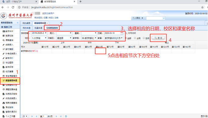 5.开放课室借用都已占用时请填写《课室使用申请表》(见附件)至公文邮箱“教务处-邬向晖wxhw@gzucm.edu.cn”