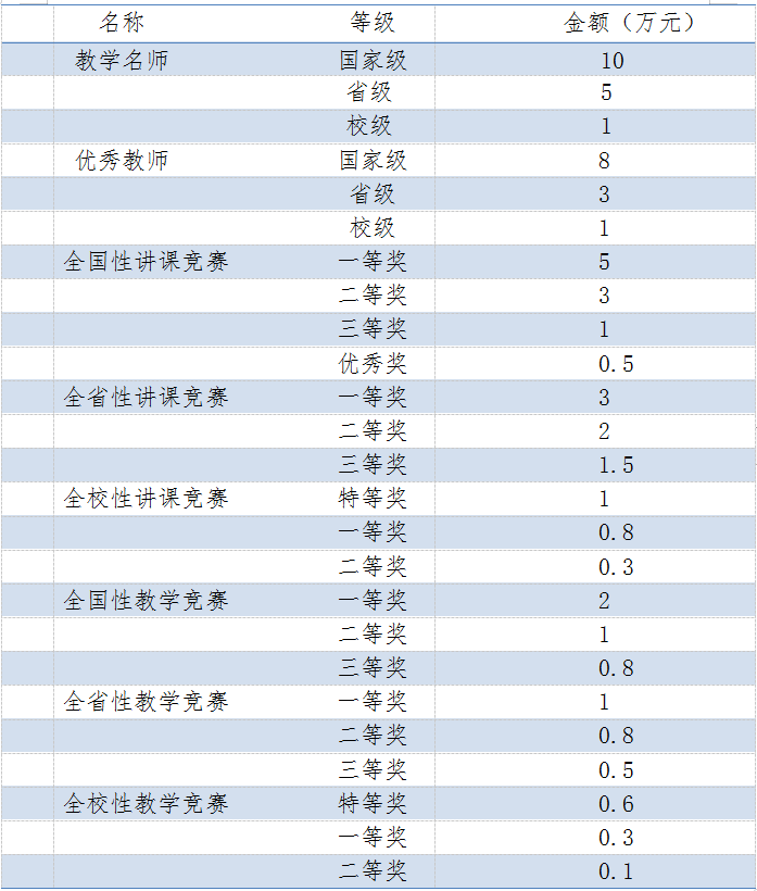 教学荣誉类:是指获得学校和省级及以上教育行政管理部门评定的教学名师、优秀教师称号的教师、参加各级教师教学竞赛获奖教师等。